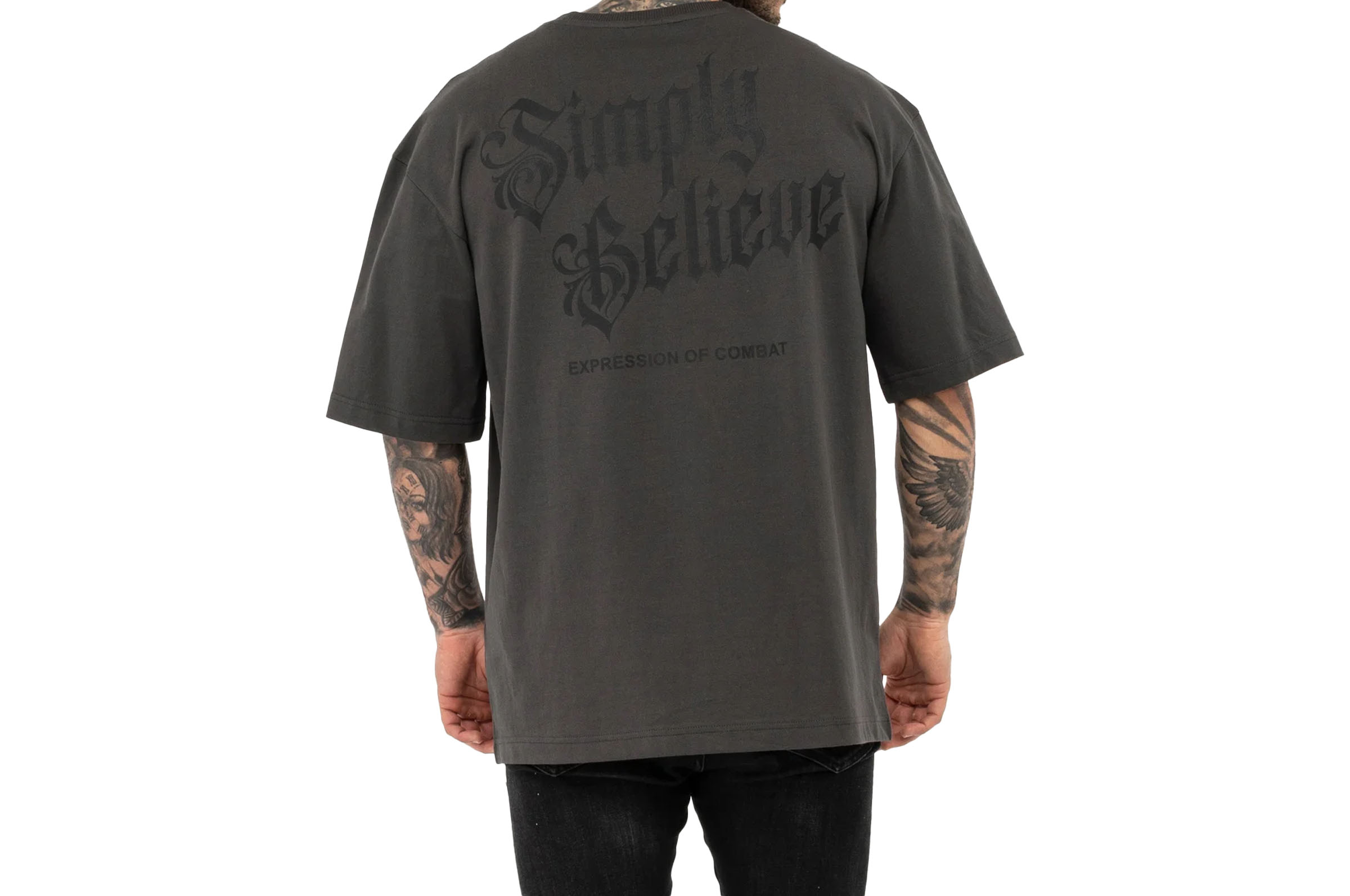 Camiseta de gola redonda, folgada, com estampados diferentes na frente e nas costas. Na frente, há uma grande impressão Tapout e, nas costas, uma grande impressão Simply Believe com uma impressão menor Expression of Combat.